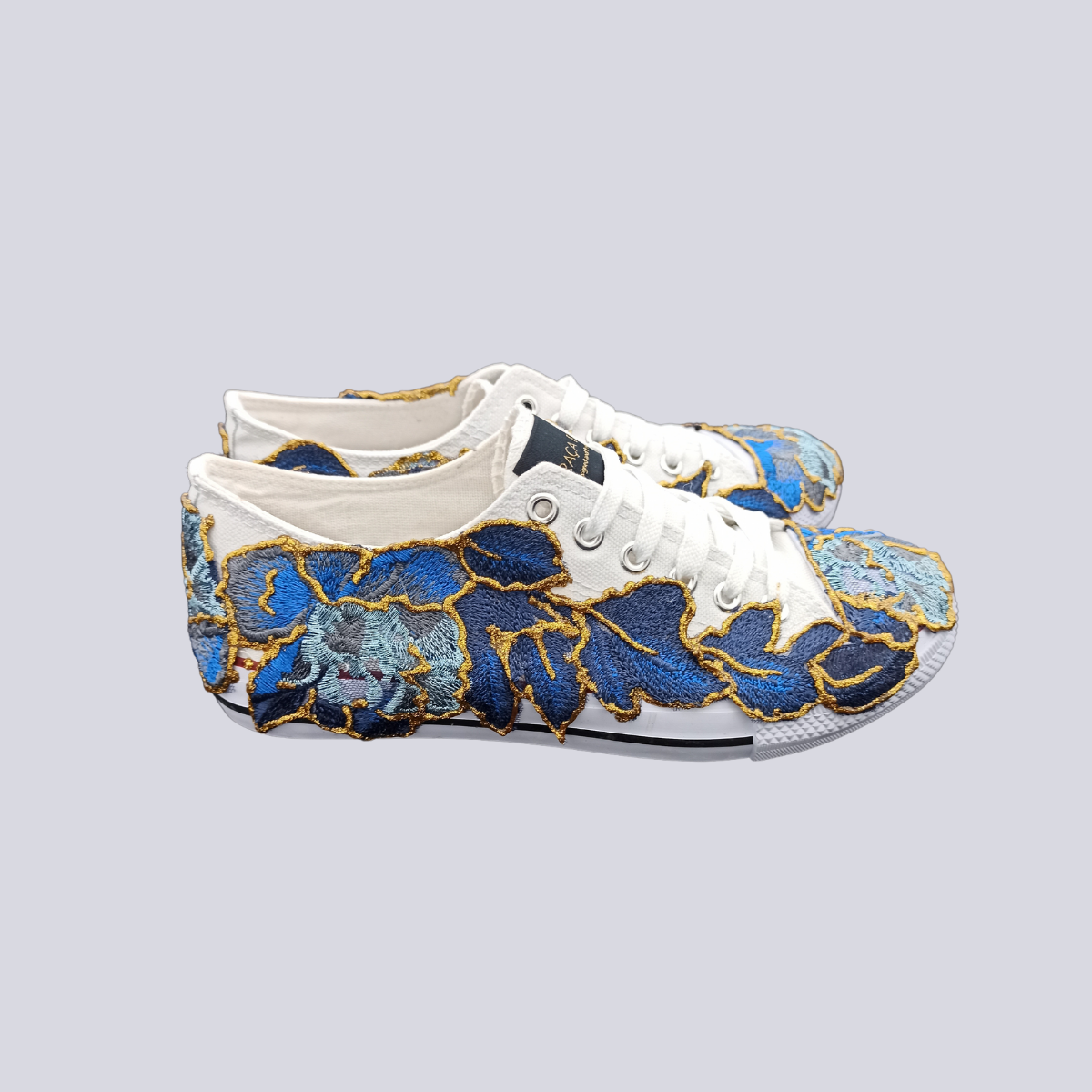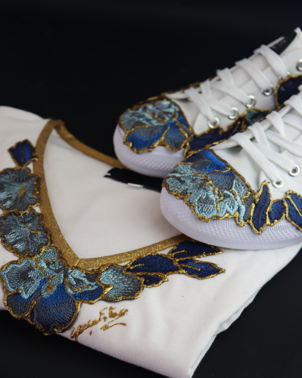 Conjunto composto por sofi-shirt azulão com as suas sapatilhas de tecido homónimas, pintadas à mão.