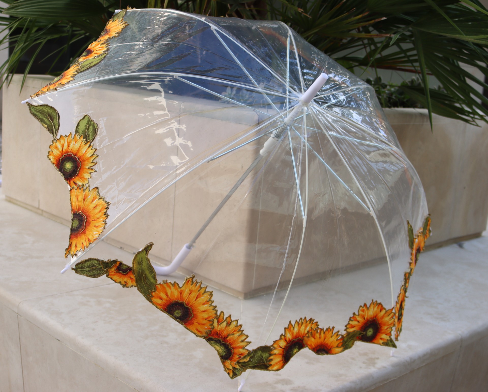 * Guarda-chuva de plástico transparente com tecido de algodão pintado à mão.