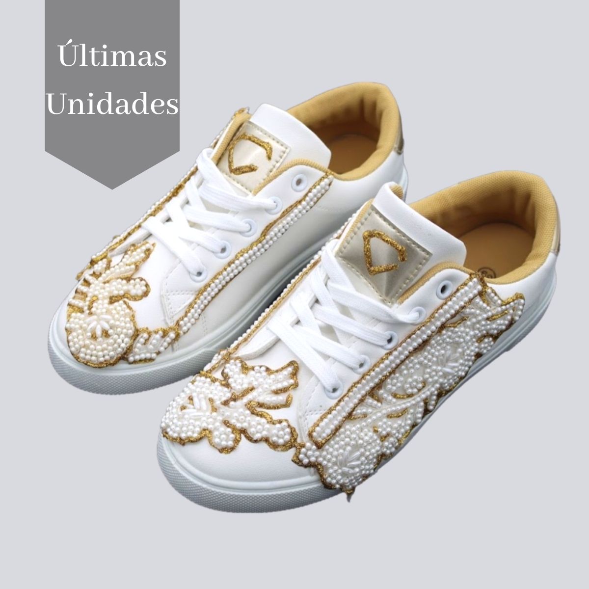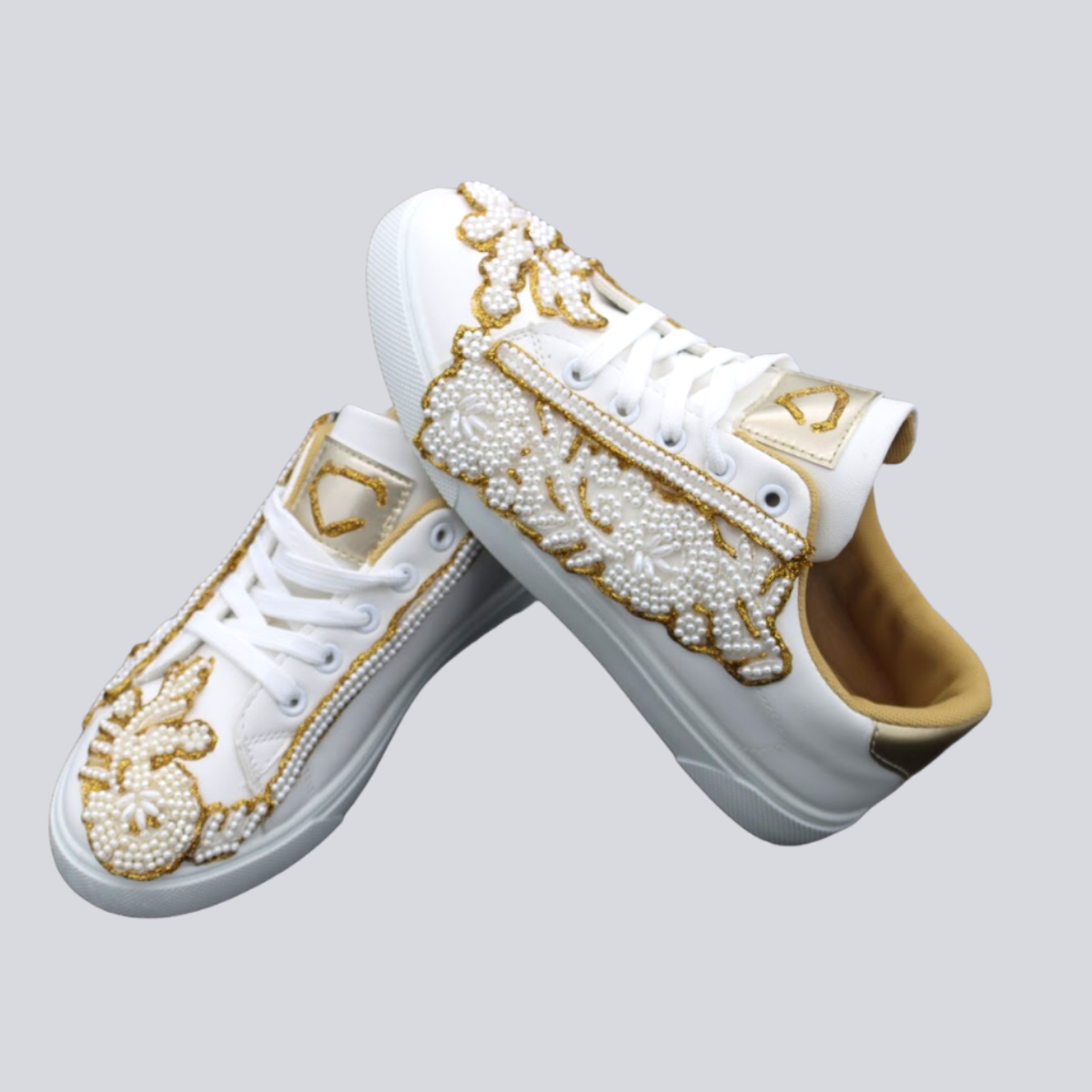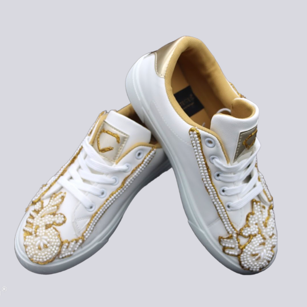 Sapatilhas em pele sintética com pérolas e pintadas à mão.