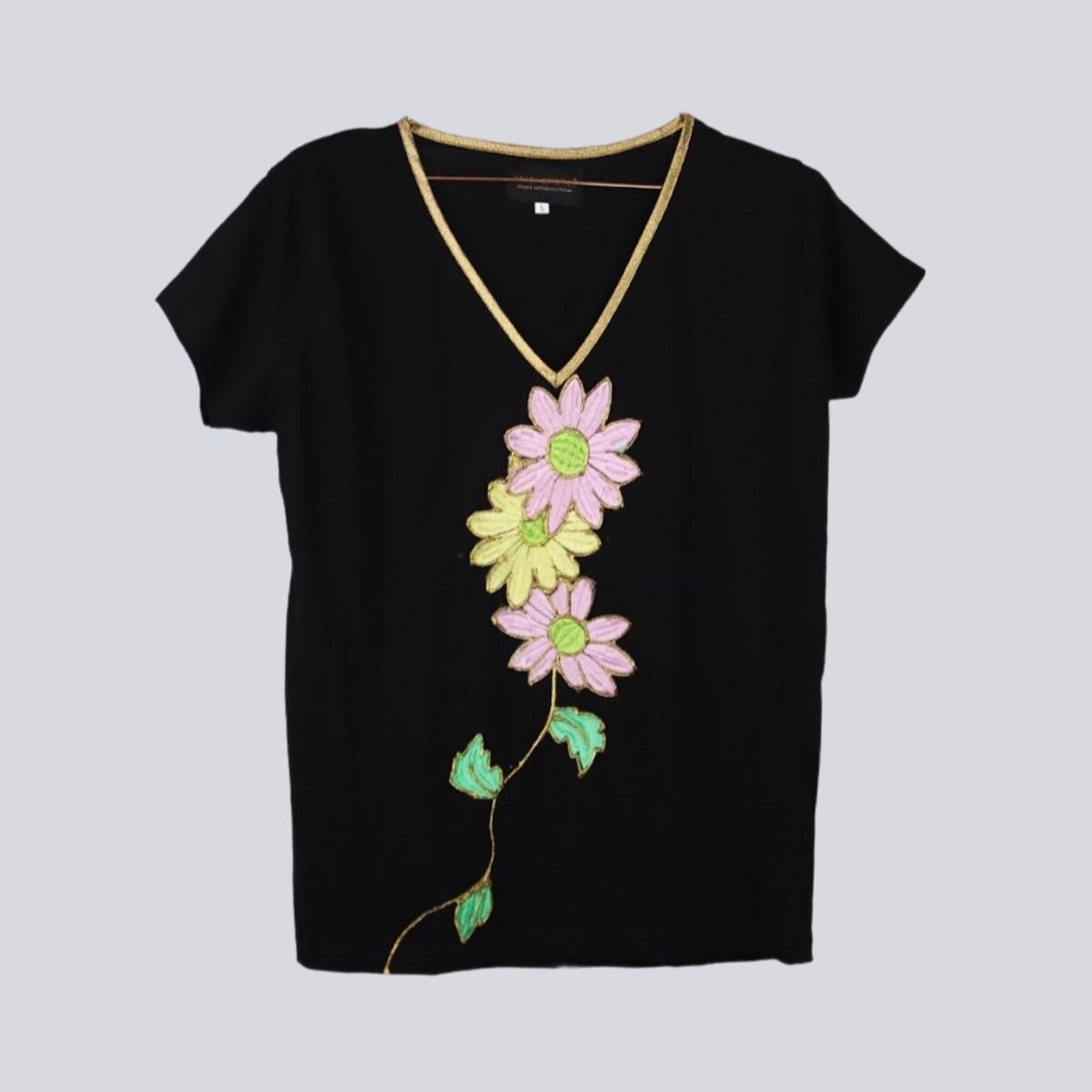 T-shirt 100% algodão com flores bordadas e pintadas à mão.